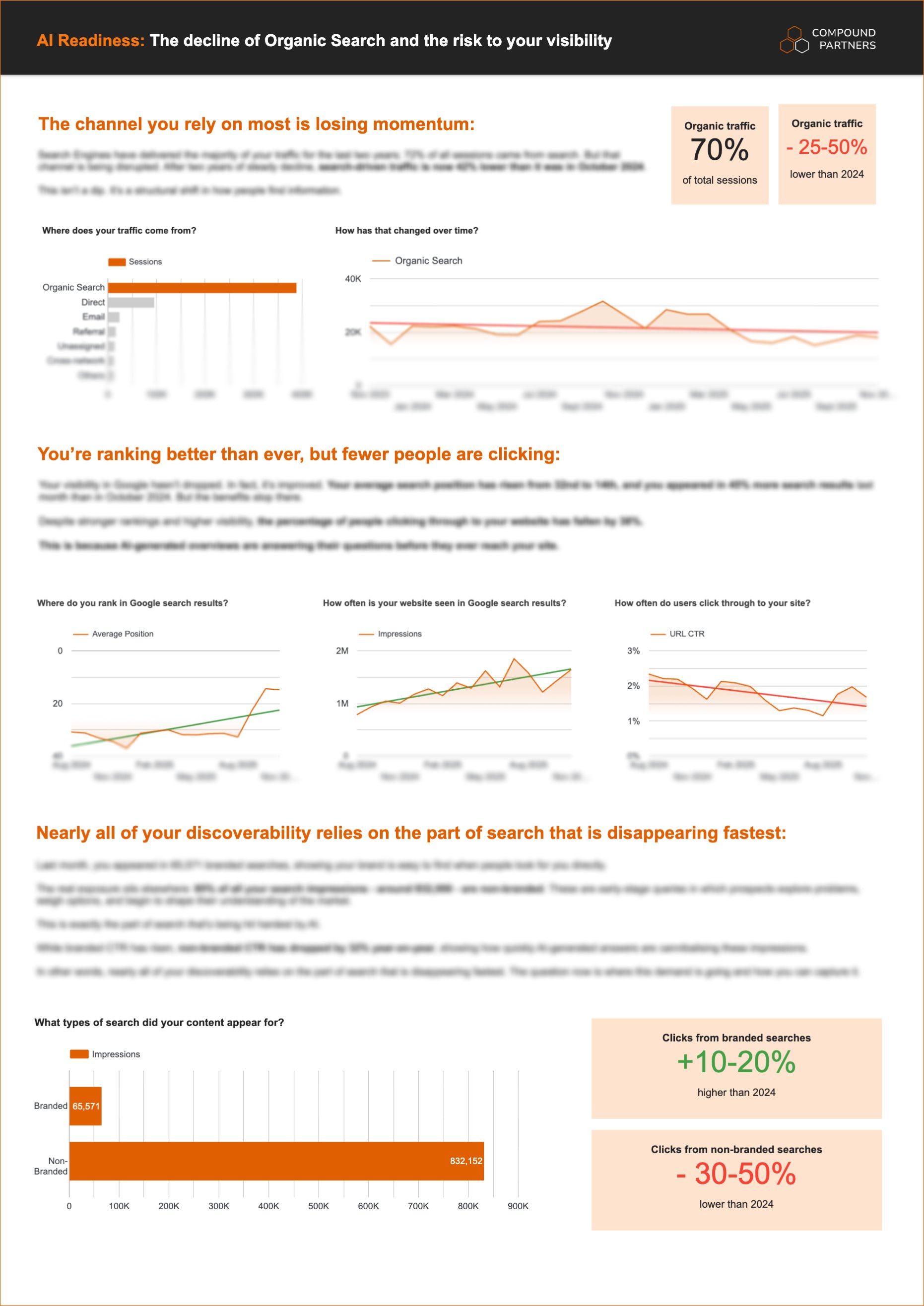 Translating your brands shifts in search performance and AI discovery into something concrete for your leadership team. We'll frame the problem, surface the evidence, and show what the next 90 days should look like.