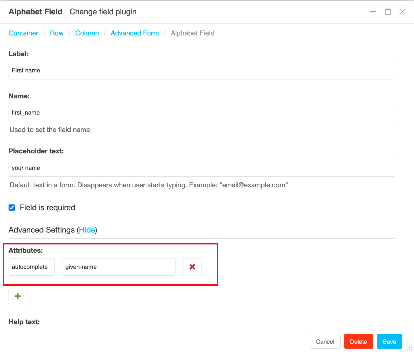 given-name,email,postal-code) Click the green + to add more attributes if needed, then Save. The attribute is rendered directly on the underlying<input>,<textarea>, or<select>so browsers and password managers can read it.